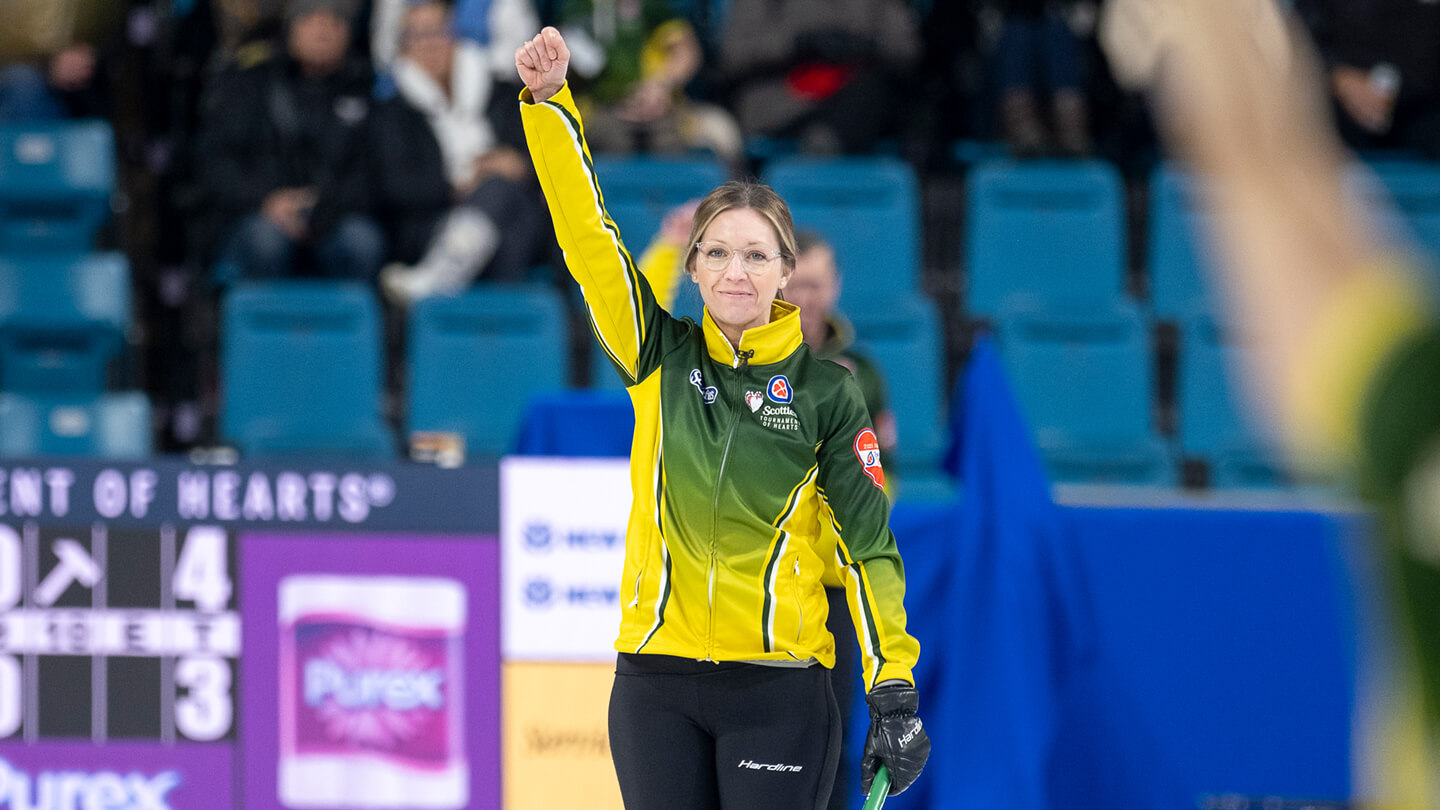 In the ninth end, Jones rolled out to give Team McCarville a steal of two, leading to a 7-5 upset win. Potts dropped to her knees on the ice in shock.