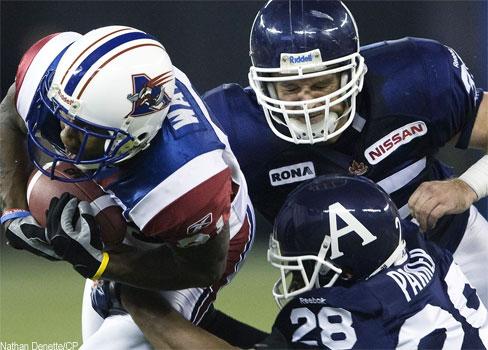 The turning point came late in the third when Toronto had a glorious chance to cement the win after Evan McCollough’s 42-yard fumble return put the home team at the Montreal nine-yard line. But on second-and-goal from the five, Argos quarterback Cleo Lemon forced a ill-advised throw to Reggie McNeal that Mark Estelle intercepted in the end zone as the quarter ended.
