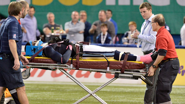 Players watched as trainers worked on Thorpe in the Toronto end zone. The import defensive back was strapped onto a board — his head immobilized — and placed on a stretcher before being carted off in what was hopefully a precautionary move.