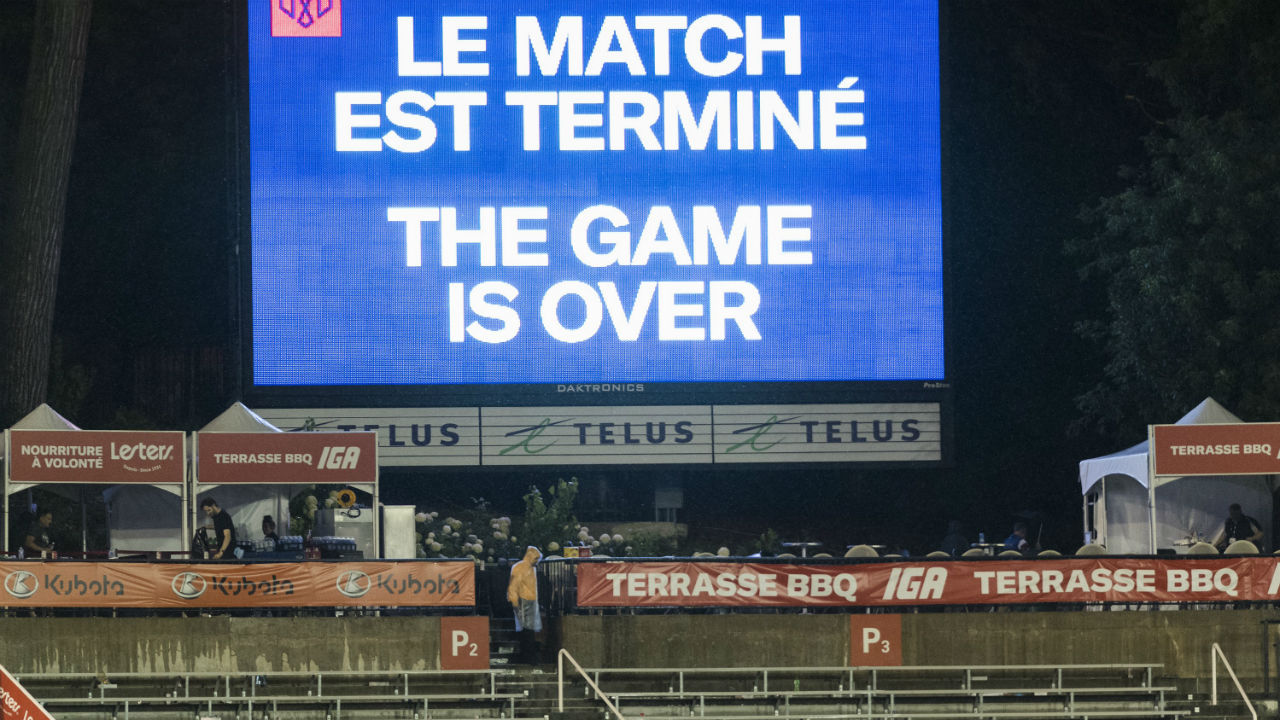 Officials called the game on account of lightning in the area following an hour-long delay with 2:41 left in the third quarter. CFL games can be called following a 60-minute delay if the match was stopped past the midway point of the third quarter.
