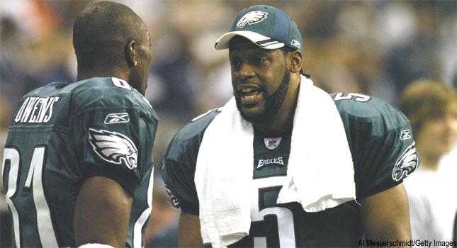 After the Eagles lost their third straight conference title game in 2003, McNabb lobbied hard to bring Owens to Philadelphia. The duo combined for an electrifying season. McNabb had a career year and Owens put up prolific numbers before he broke his ankle in late December. Owens returned to play in Philadelphia’s loss to New England in the Super Bowl.
