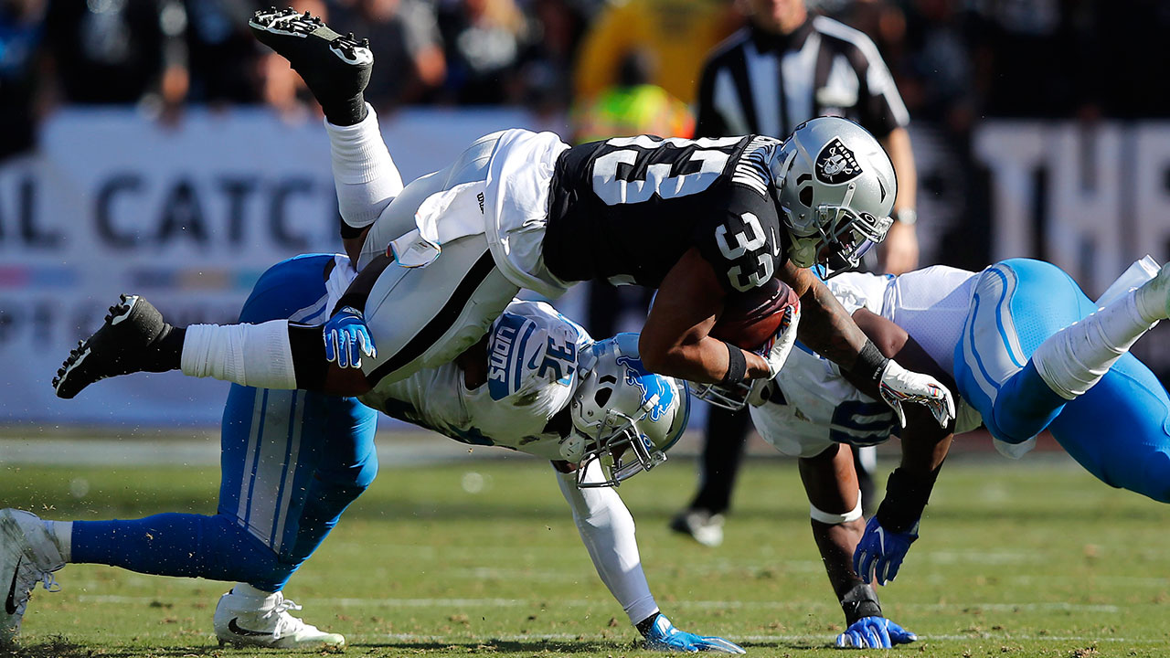 Daryl Worley then intercepted a pass by Worley in the end zone with the Lions looking to build on a 14-10 lead. Oakland drove 80 yards and scored on Jacobs’ 3-yard run to make it 17-14 at the half.