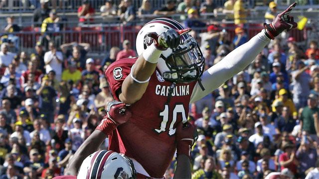 South Carolina defensive end Jadeveon Clowney was quiet for much of the day, but shifted momentum in the fourth quarter with a big hit on Vincent Smith that sent the running back’s helmet rolling several yards backward and caused a fumble that the SEC defensive player of the year recovered to set up Shaw’s TD pass to Sanders for a 27-22 lead.