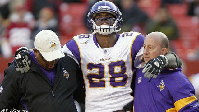 Toby Gerhart finished up the game, and Peterson said later that his abdomen was too sore to continue playing. He rebounded with the monster game against Green Bay the following week and even played in the Pro Bowl with the injury.