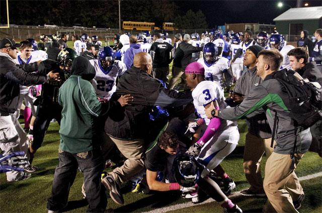 Last but not least, players and coaches from Huron and Pioneer High Schools scuffle following the conclusion of a high school football game in Ann Arbor, Mich.