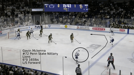 The second clip comes from the game Friday night versus Clarkson. Notice how McKenna rotates at the top of the zone and, in the process, baits two Clarkson defenders into panicking on a decision. Instead of remaining in place with poise they end up getting tangled up while attempting to front McKenna, which leads to an easy back door feed and a power play goal for Penn State: