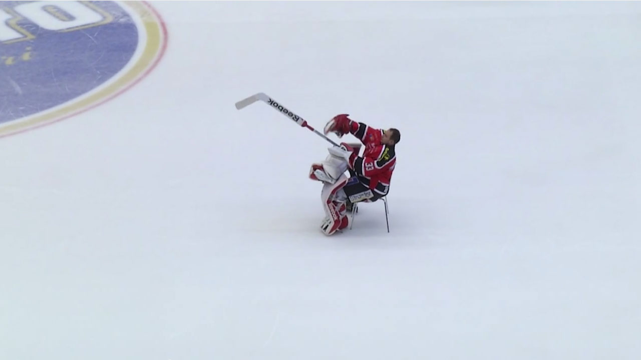 He grabbed a chair, sat down and mimicked going ice fishing, but that wasn’t the end of the spectacle. Hudacek also decided to ride on the ice surfacing machine and join the supporters in cheering the victory: