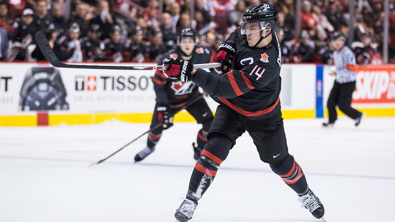 Canada’s Maxime Comtois takes a shot on goal during first period against the Czech Republic. (Darryl Dyck/CP)
