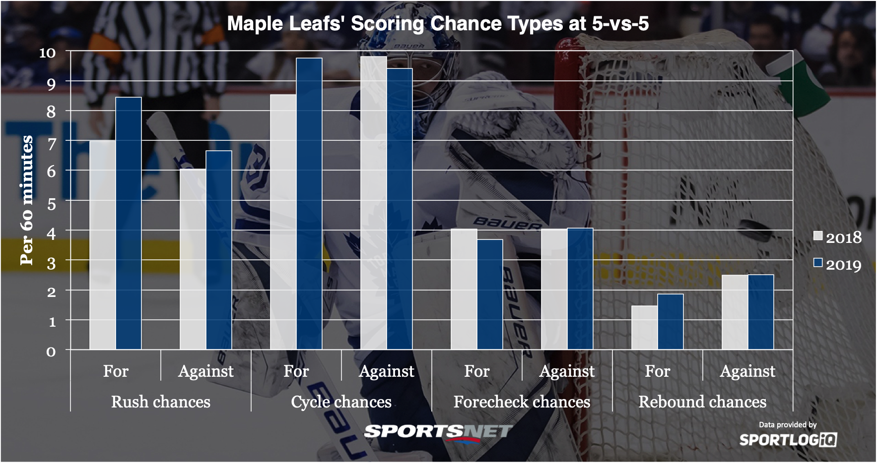 The Leafs rank 30th in the league in net-front defence all season, which at times makes things tougher on Andersen. However, the change from 2018 to 2019 is miniscule, so this isn’t the main problem either.