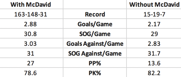Sportsnet Stats has accumulated a stats pack breaking down how the Oilers have performed with McDavid in the lineup versus without going back to his first season in 2015-16.