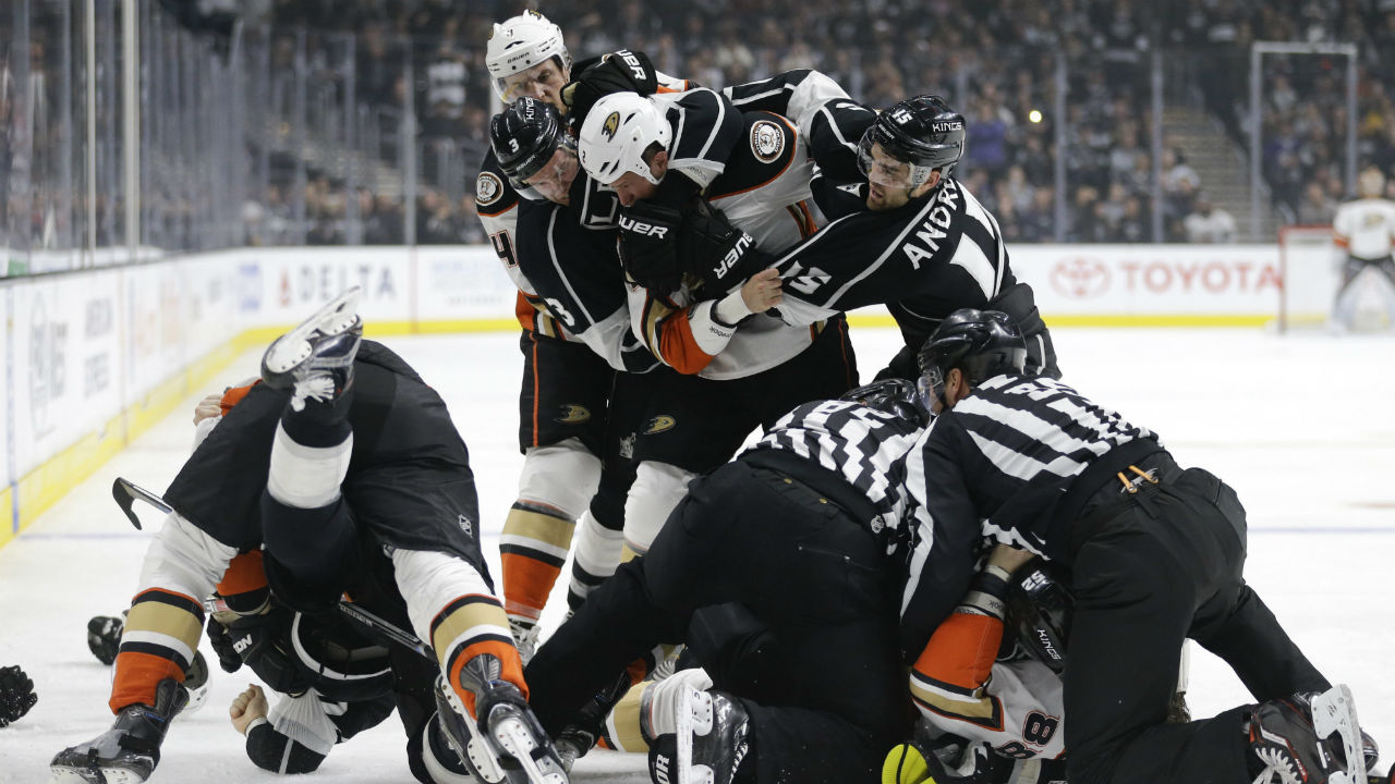 What began as a routine collision along the boards between Kyle Clifford and Ducks leading goal-scorer Corey Perry in the Los Angeles zone at 6:58 of the first period turned into a shoving match between them – then escalated into a free-for-all that resulted in 66 penalty minutes in one fell swoop.