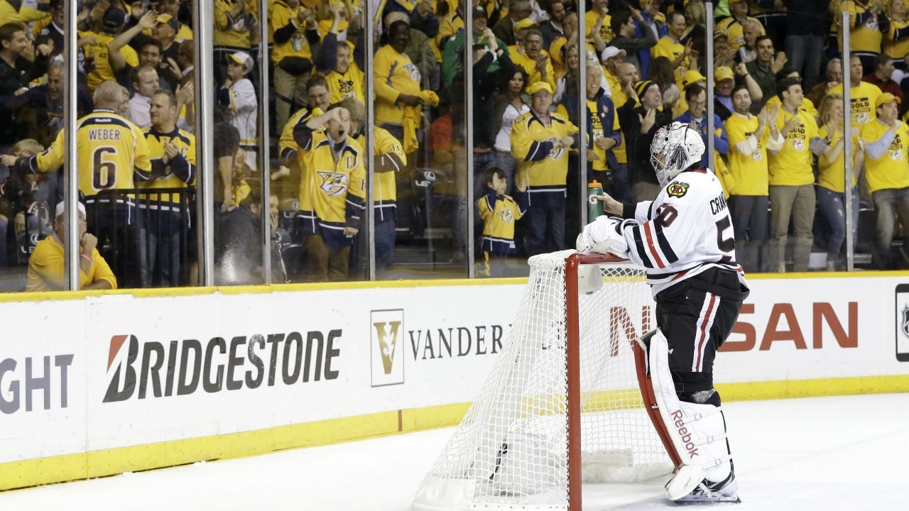 Nashville jumped out to a 3-0 lead through 20 minutes. Colin Wilson scored twice, and former Chicago forward Viktor Stalberg scored on a wraparound into an empty net when Crawford got caught trying to play the puck behind the net. The Predators took 58 shots, a franchise record in the post-season, against both goalies.