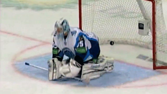 Poor Kevin Lalande hangs his head for good reason, as he gets beat by a “shot” that is, in truth, a hastily swatted puck from just inside the centre line that happens to find a path between his legs.