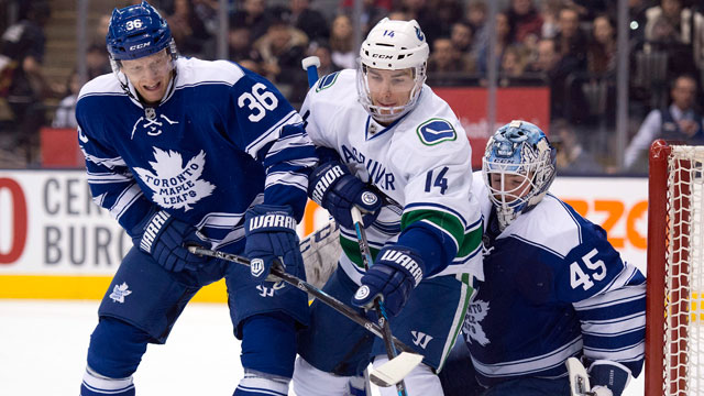 The Maple Leafs are such a fickle team. They can control a period like they did Saturday night in the first, earning several quality scoring chances and running the shot count to 8-1 ten minutes in, before seemingly losing the handle of their sticks and coughing the puck up uncontrollably. Canucks winger Ryan Kessler scored with less than a minute left in the first, throwing his stick out at a Chris Higgins shot that Maple Leafs goalie Jonathan Bernier never saw. What was shaping up to be something coaches call a-good-period-to-build-on quickly turned into a one-goal deficit heading to the second.