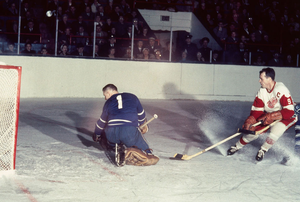 Gordie Howe of the Detroit Red Wings scores a goal against Johnny Bower of the Toronto Maple Leafs at Maple Leaf Gardens. (Denis Brodeur/NHLI via Getty Images)
