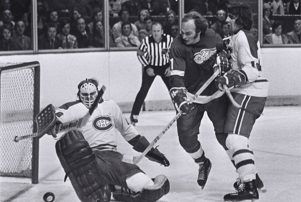 Ken Dryden blocks the puck while Serge Savard (18) of the Montreal Canadiens helps defend the goal against Leon Rochefort (11) of the Detroit Red Wings during a game at the Montreal Forum circa 1972. (Denis Brodeur/NHLI via Getty Images)