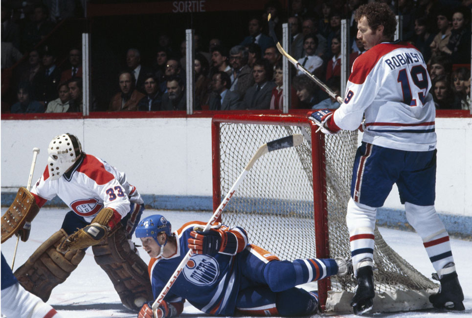 Wayne Gretzky (99) of the Edmonton Oilers skates against Larry Robinson (19) and goaltender Richard Sevigny of the Montreal Canadiens in the 1980’s at the Montreal Forum. (Denis Brodeur/NHLI via Getty Images)