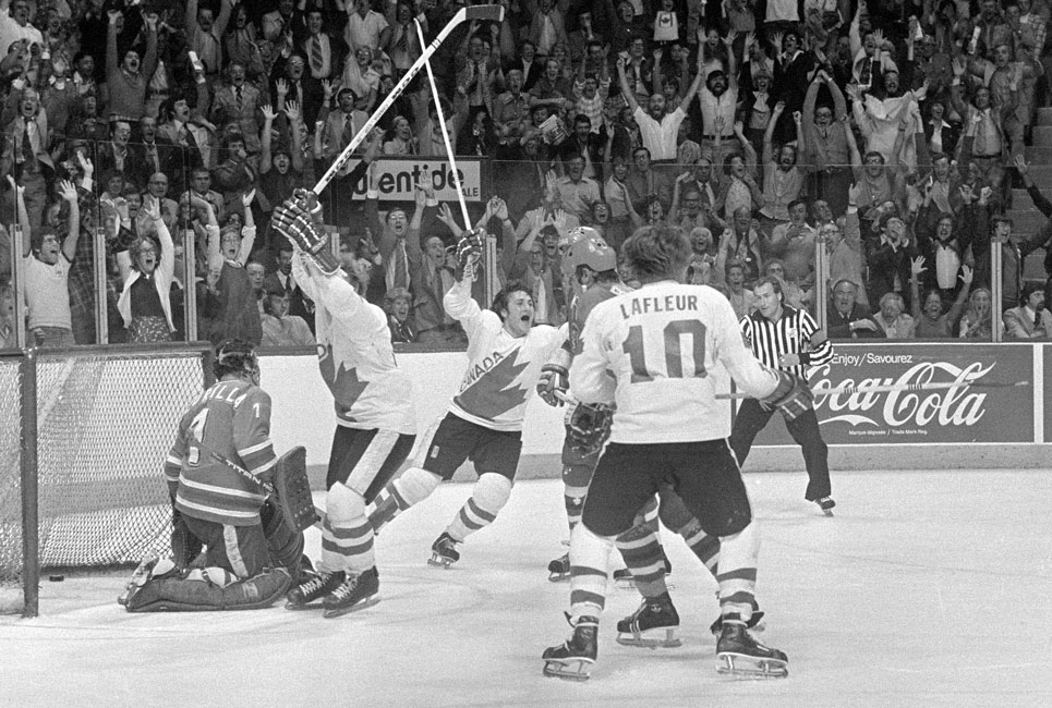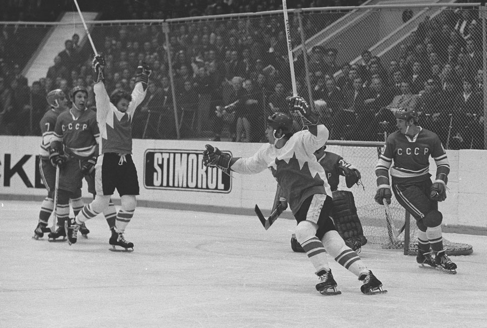 Paul Henderson (with helmet) and Bobby Clarke celebrate Henderson’s series-winning goal in Game 8 of the 1972 Summit Series between Canada and the Soviet Union at the Luzhniki Ice Palace in Moscow, Soviet Union on September 28, 1972. (Denis Brodeur/NHLI via Getty Images)