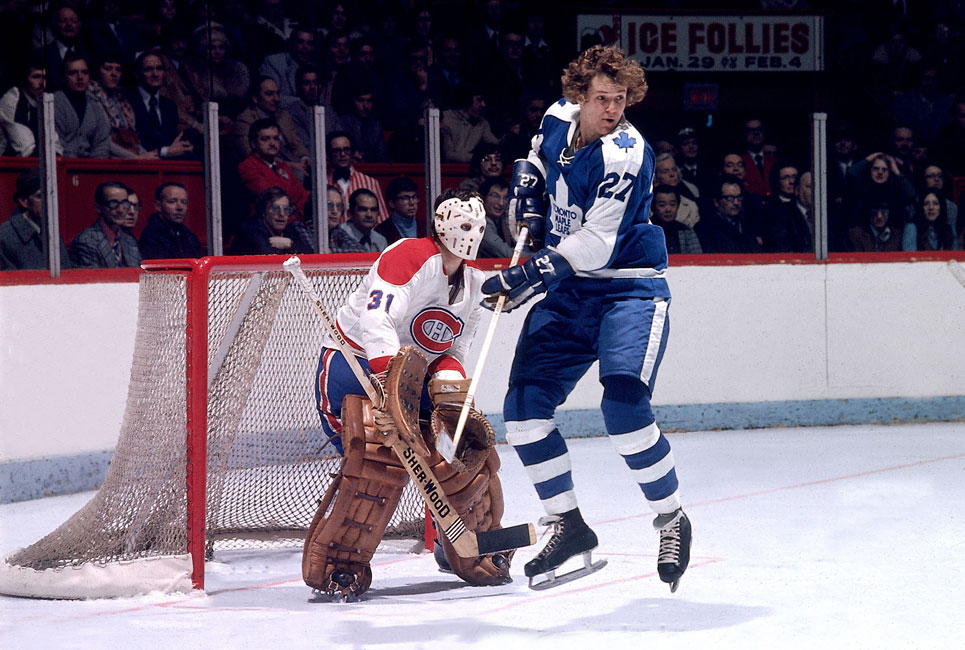 Darryl Sittler of the Toronto Maple Leafs screens goalie Michel Larocque of the Montreal Canadiens. (Denis Brodeur/NHLI via Getty Images)