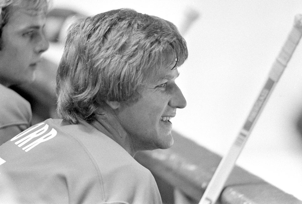 Bobby Orr (4) of Team Canada looks on from the bench during practice for the Canada Cup series at the Montreal Forum in September of 1976. (Denis Brodeur/NHLI via Getty Images)
