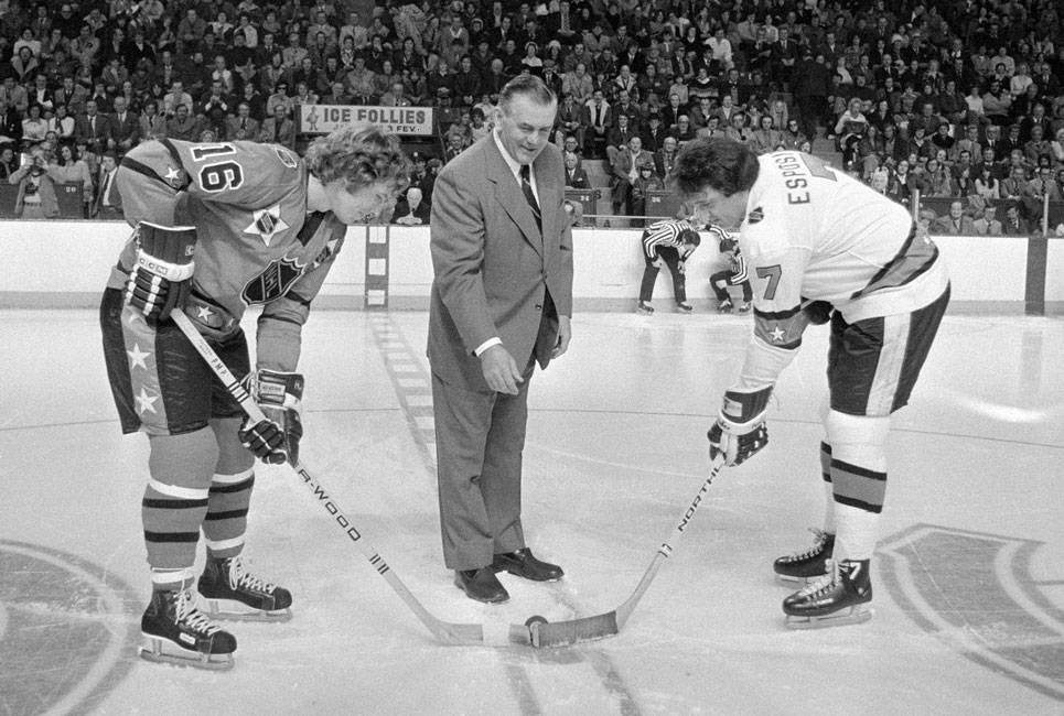 Maurice Richard drops the puck during the opening face-off between Bobby Clarke (16) of the Campbell Conference and Phil Esposito (7) of the Wales Conference at the start of the NHL All-Star Game at the Montreal Forum on January 21, 1975. (Denis Brodeur/NHLI via Getty Images)