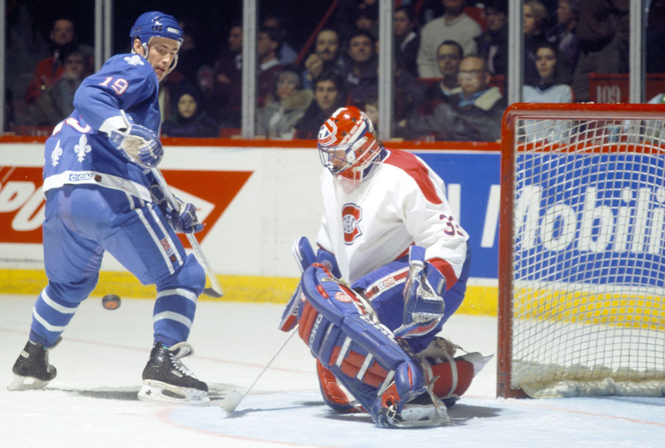 Joe Sakic (19) of the Quebec Nordiques skates against goaltender Patrick Roy of the Montreal Canadiens in the early 1990s at the Montreal Forum. (Denis Brodeur/NHLI via Getty Images)