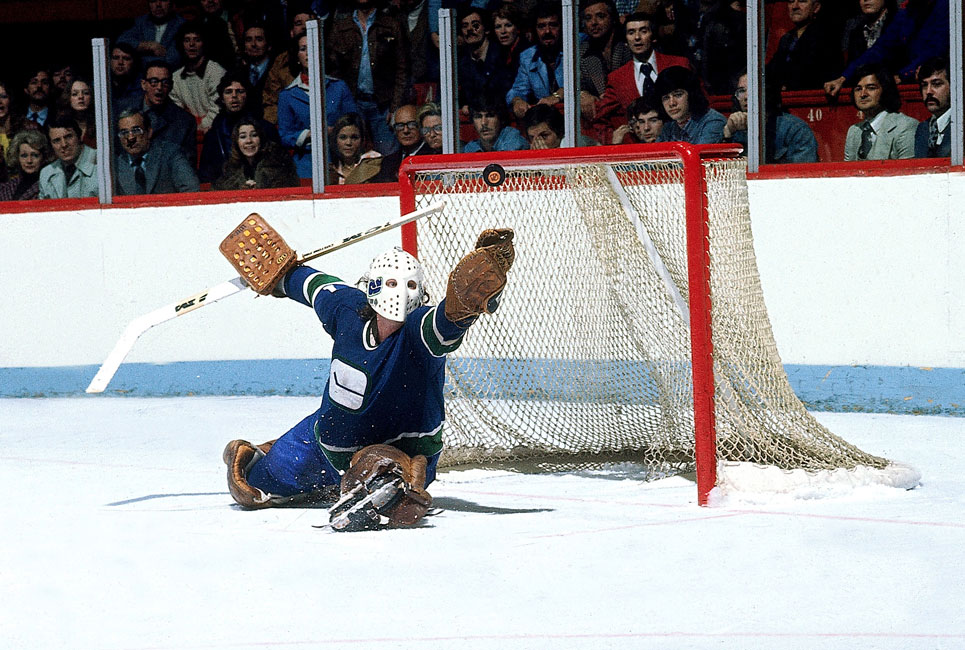 Goaltender Gary Smith of the Vancouver Canucks makes a glove save against the Montreal Canadiens circa 1976 at the Forum. (Denis Brodeur/NHLI via Getty Images)