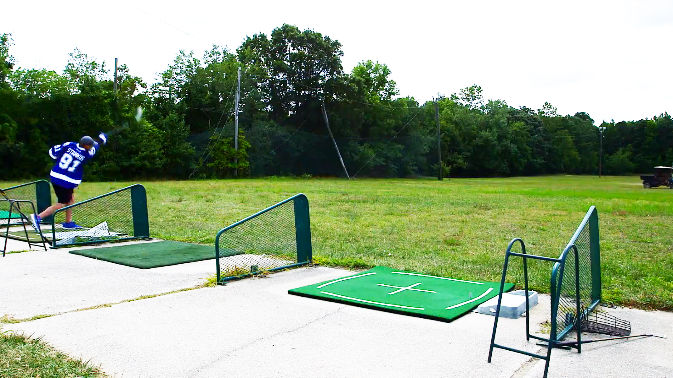 During his visit to the Tilton Road Golf Range in Northfield, N.J., not only does he smack the 75-yard sign and the 100-yard sign, Stamkos does what any self-respecting driving range attendee would do: he aims for the guy picking up stray balls in the cart: