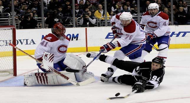 Kopitar tied it at 18:16 of the first period with his 10th goal in 12 games. Jack Johnson cleared the puck off the left boards and into the Montreal zone, where Kopitar won a foot race with Glen Metropolit before swerving in front of the crease and beating Halak to the glove side with a backhander.