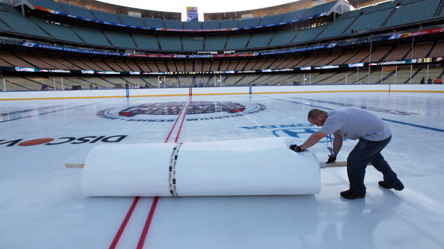 The boards, benches and glass were trucked into Dodger Stadium from the Winter Classic at Ann Arbor’s Michigan Stadium, although they won’t need the heaters. The NHL is also embracing the unusual setting with a variety of amusements in the Dodger Stadium bowl — everything from a beach volleyball court and a pond to two performance stages.