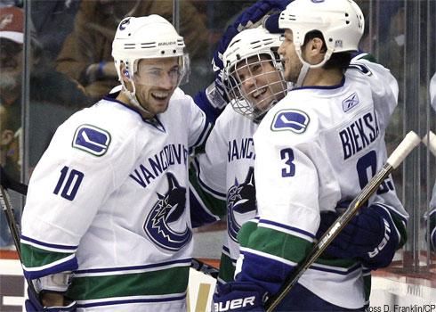 Cody Hodgson scored his first career goal, Ryan Kesler added a pair to reach 30 for the season, and Alex Burrows, Jannik Hansen and Mason Raymond also scored for the Canucks, who have won four straight and have points in seven consecutive.