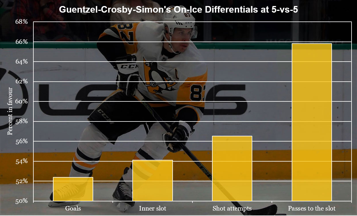 Guentzel and Dominik Simon are still one and two in the league in total slot pass receptions, and the trio of players are the only three in the entire NHL to be on the ice for seven or more successful slot passes every 20 minutes of ice time this season.