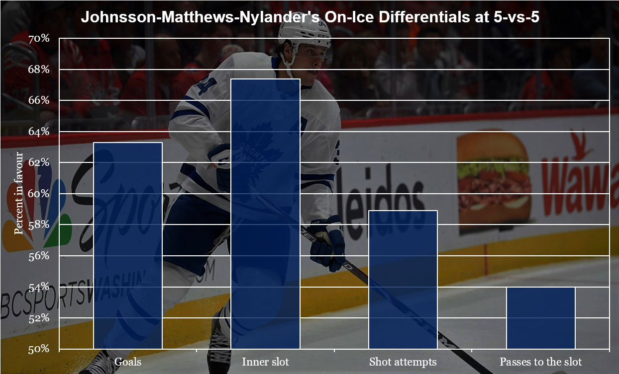 Even William Nylander, commonly thought of as a perimeter player, is ripping shots from close to the net on a consistent basis. Matthews has always been a dominant player near the net — and Andreas Johnsson is no slouch in that area either — so the offence isn’t surprising, but what is a bit of a shock is that the Matthews line has also been the best defensive line on the Leafs so far this season.
