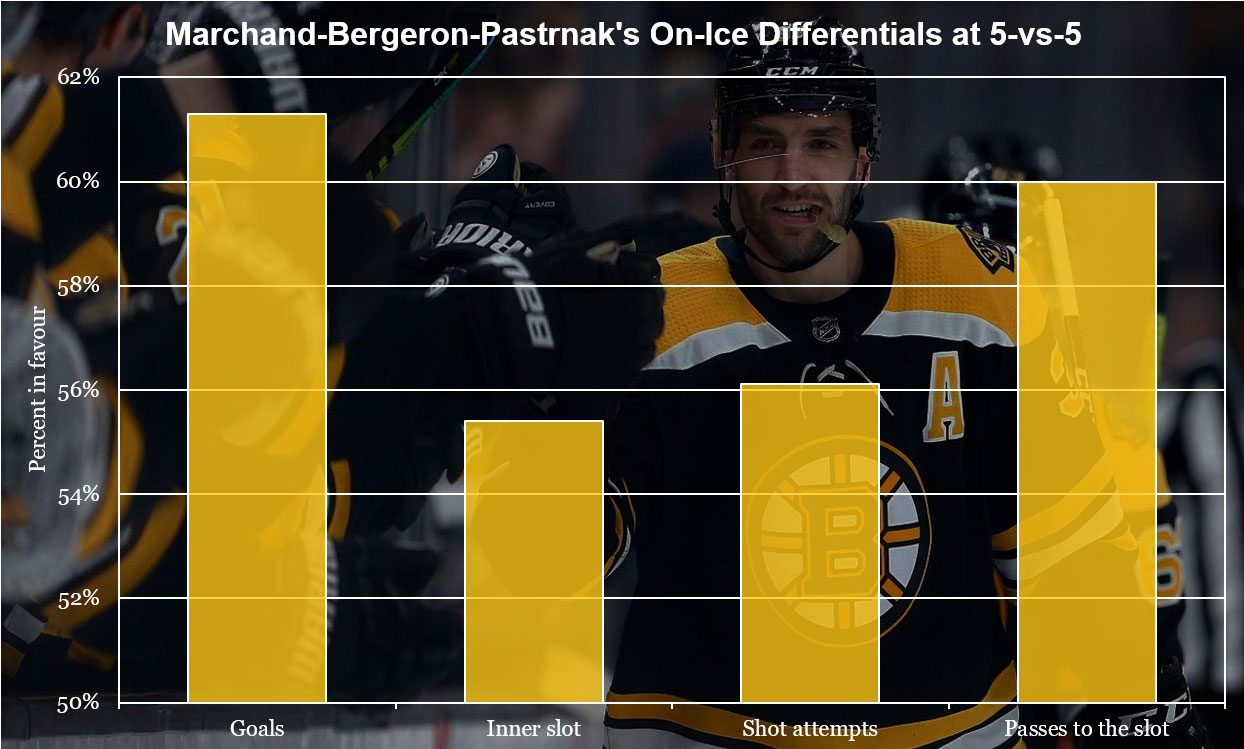 Their most dominant area of play is controlling slot passes but it’s not actually defending them that they make the biggest impact, it’s creating slot passes for each other. The Bruins take more one-timers at 5-on-5 than any other team in the league and a big reason why is the puck moving ability of this top line, specifically setting up David Pastrnak for his exceptional shot in the high slot.
