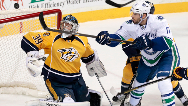 From the left side, Jason Garrison’s slap shot was stopped by Nashville goaltender Marek Mazanec, but Kesler outmuscled Nashville’s David Legwand for the rebound and beat Mazanec with a wrist shot.