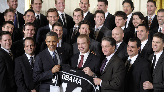 Obama honoured the Los Angeles Kings of the National Hockey League, whose Stanley Cup was on display in the East Room. He also welcomed the LA Galaxy, the championship Major League Soccer team.