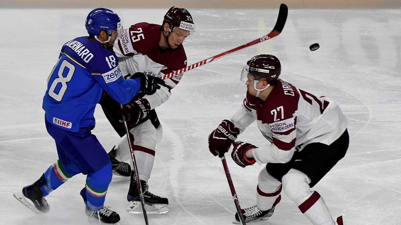 PARIS — Centre Andris Dzerins scored his second goal of the game with a little more than one minute left as Latvia beat Italy 2-1 at the ice hockey world championships on Tuesday to remain top of Group A, ahead of Russia.
