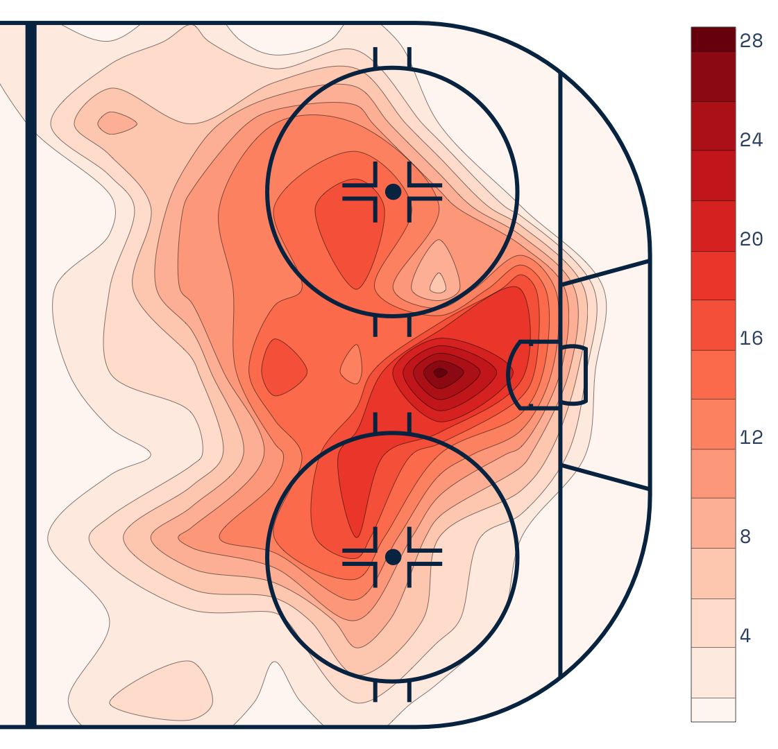 What you can also see from the heat map is that Draisaitl’s shots are much more focused to inside the slot than Ovechkin’s, and he also likes to shoot from the Ovi spot.