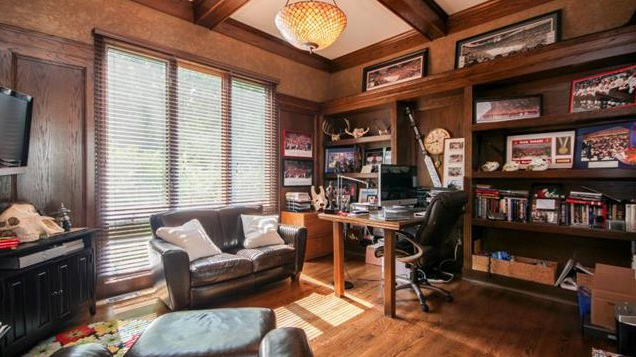 The kitchen has wraparound cabinets and high-end appliances, and the living room has double-decker windows. The study, with its built-in shelves and dark wood paneling, is a space befitting the only coach in the International Ice Hockey Federation’s Triple Gold Club.