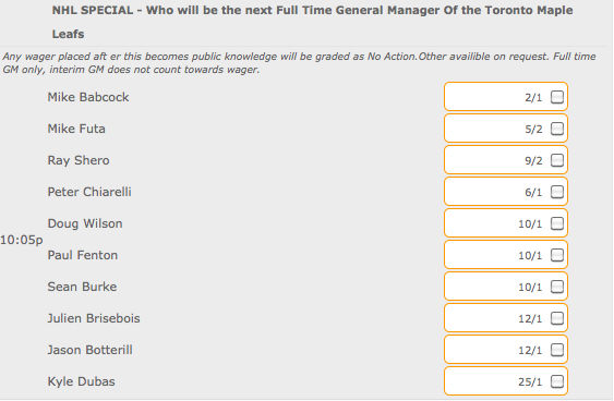 leafs-gm-odds Mike Johnston April 16, 2015, 5:55 PM Mike Johnston April 16, 2015, 5:55 PM Sportsnet.ca no longer supports comments. LATEST DEFAULT NEWS