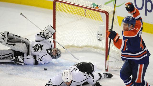 Hall stepped on a puck and fell during the warmup, taking out teammate Ladislav Smid from behind. The two slid into the boards, and an oncoming Corey Potter tried to jump over them, catching Hall in the forehead with his skate. It was, as one scribe called it, a three-car pileup in Turn 2.