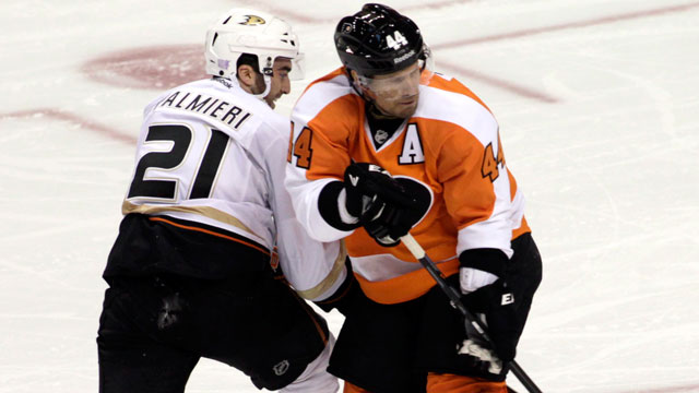 Kyle Palmieri scored two straight goals in the third period to rally the Anaheim Ducks past the Philadelphia Flyers 3-2 on Tuesday night.
