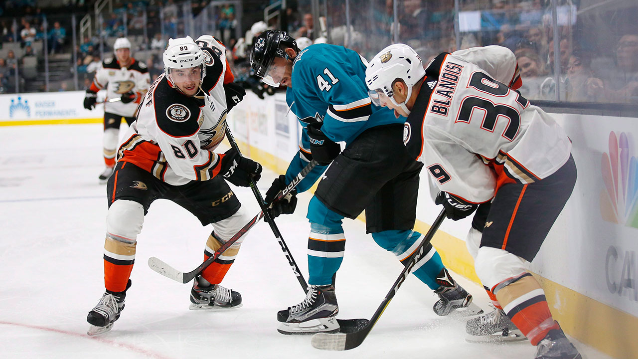 Anaheim Ducks' Deven Sideroff, left, and Joseph Blandisi work for the puck against San Jose Sharks' Vincent Praplan. (Josie Lepe/AP)