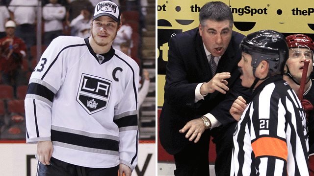 Brown, the Kings’ leading scorer with 16 playoff points, knocked Coyotes defenceman Michal Rozsival out of the game with a knee-on-knee collision (watch above). The only whistle on the play occurred before the hit, and it signaled offside. No penalty was called, and the Coyotes were livid, especially captain Shane Doan.