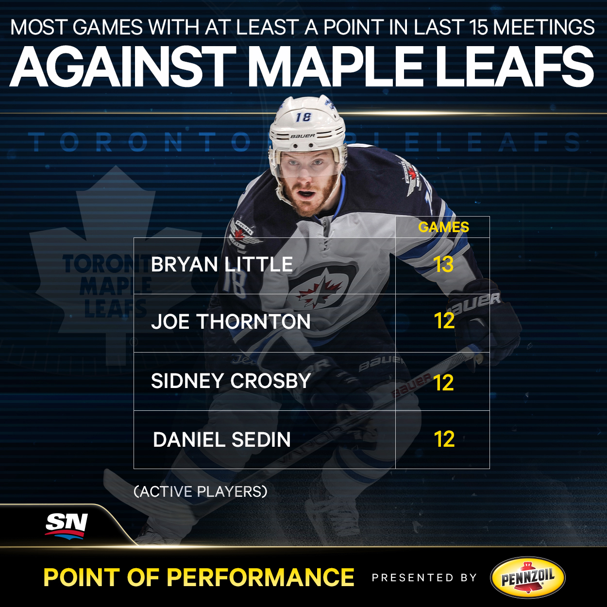 Point of Performance: Bryan Little has the Maple Leafs’ number Winnipeg Jets center Bryan Little, upper right, celebrates a goal. (Mark J. Terrill/AP) Sportsnet Staff December 2, 2015, 10:02 PM Sportsnet Staff December 2, 2015, 10:02 PM Bryan Little has had a lot of success against the Maple Leafs. Can he keep it going Wednesday when his Jets host Toronto on Sportsnet? Sportsnet.ca no longer supports comments. LATEST NHL NEWS 32 Thoughts Podcast: The holiday spectacular 23 hours ago NHL's Best of 2025 on Sportsnet 1 day ago Oilers continue December surge with McDavid, Draisaitl operating at full force 2 days ago NHL Roundup: Panthers rally with five-goal third period to beat Hurricanes 2 days ago Takeaways: Flames overwhelmed by Oilers' stars, power play 2 days ago Draisaitl, McDavid shine as Oilers rout Flames in Battle of Alberta 2 days ago Canadiens take gifts from Bruins to end pre-holiday slog on a high 2 days ago Senators feeling confident heading into Christmas break 2 days ago