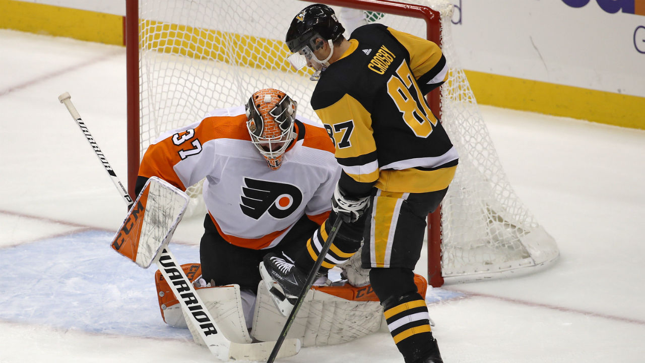 Sidney Crosby, wearing a facemask as extra protection after getting hit in the head by a shot over the weekend, had a goal and two assists to boost his career point total against the Flyers to 102. Dominik Simon and Dominik Kahun also had a goal and two assists apiece for Pittsburgh, which finished a busy October 8-5-0, not bad considering forwards Evgeni Malkin, Bryan Rust, Nick Bjugstad and Alex Galchenyuk were among the group that watched the majority of the action from the press box while sidelined with injuries.