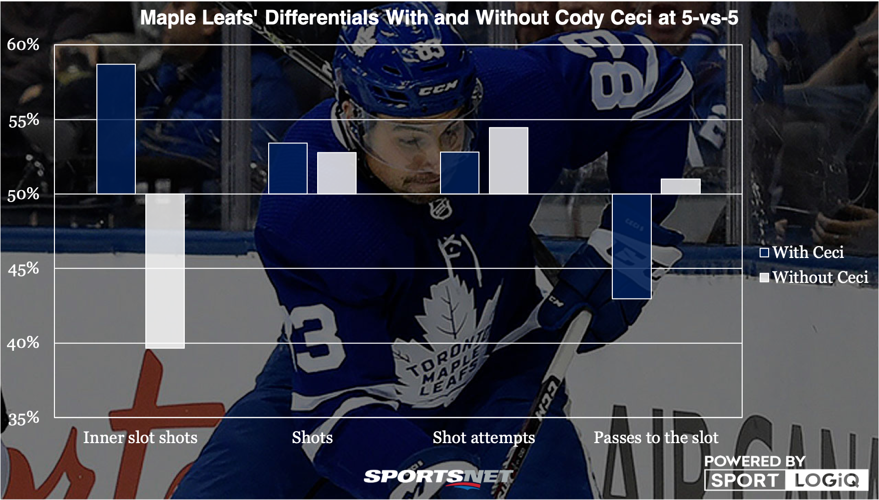 There are a few wrinkles to iron out in this narrative, though. It’s tough to separate Ceci’s impact from the stellar start that the Leafs’ top line is having, and the Matthews line has been particularly outstanding while Rielly and Ceci are on the ice.