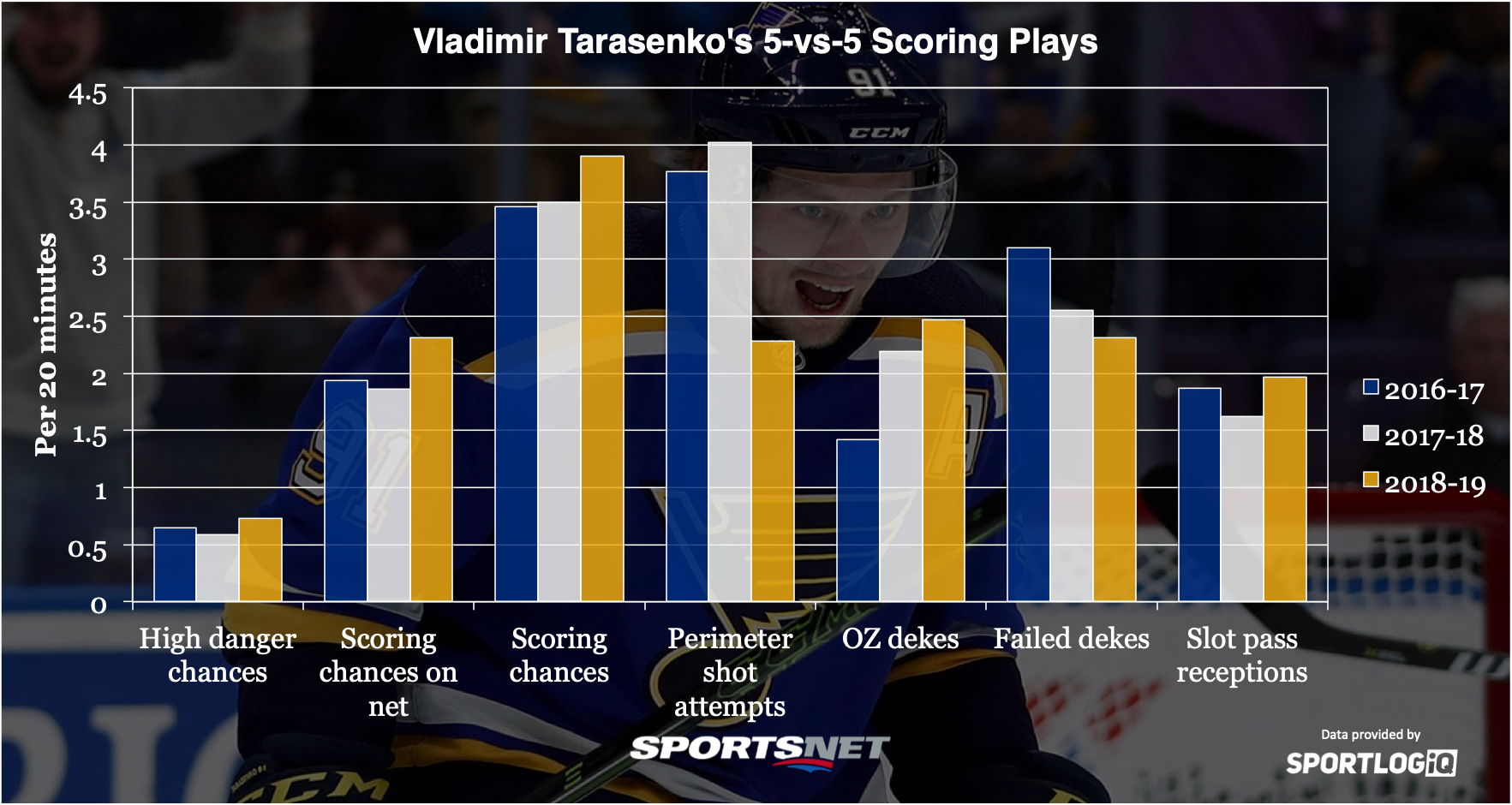 The only area where Tarasenko has seen his performance dip is in his shots from the perimeter, where he’s seeing about half as many opportunities as usual. Those shots have about a four per cent chance of going in for an average player, and just 11 of Tarasenko’s 57 even strength goals have come from outside the slot the past two seasons combined — and four of those were only a hair outside the slot. Nearly 53 per cent of his shot attempts the past two seasons came from the perimeter, though only 19.3 per cent of his goals came from there. Because of that, I’m not buying into the idea fewer perimeter shots has depressed his goal scoring in some way.
