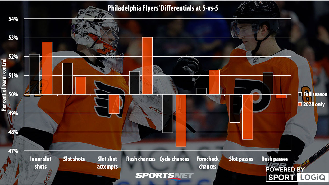If you were going to choose two areas of the game to have control of, those two would likely be chosen between inner slot shots, rush chances, and slot passes, and the Flyers have controlled two of those three at decent clips. But they’re not blowing anyone away either, at least by the underlying numbers.