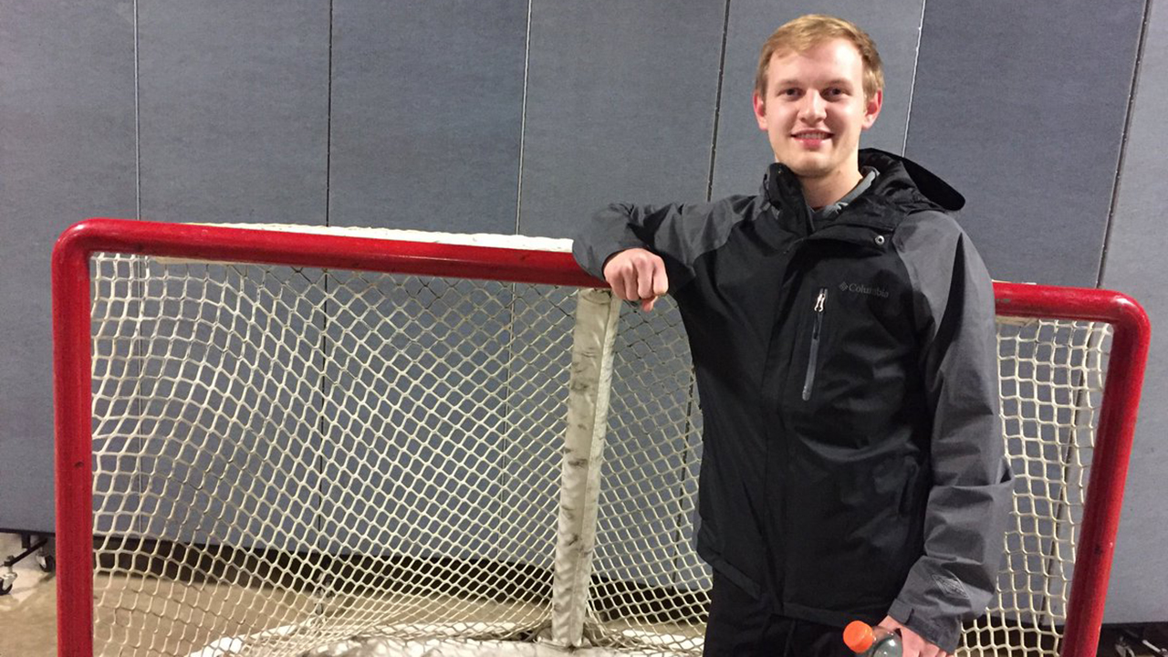 Season-ticket holder Tyler Stewart participated in pregame warmups and watched from the dressing room in the first period of the Blues’ game against the Dallas Stars.